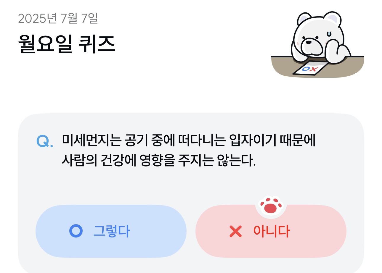 오늘의 퀴즈 정답: ❌ “미세먼지는 건강에 영향을 주지 않는다” → ✨ 정답은 '아니다'입니다.